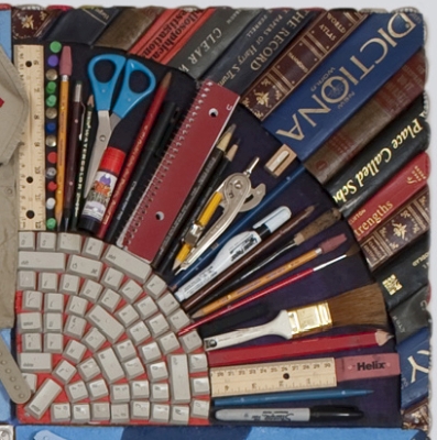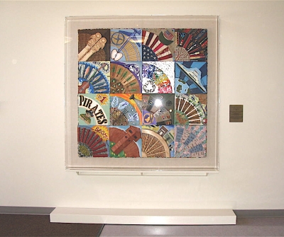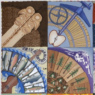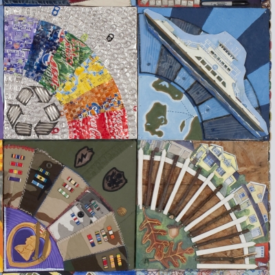 Ross Palmer Beecher's Parlour Fan Quilt uses found materials and objects to represent the rich heritage of Steilacoom and DuPont. The artist worked with community members to collect their ideas about what should be represented in the quilt. She also recruited their help to gather local objects to represent those ideas. The quilt consists of sixteen quilt squares that include oil paint on wood and tin, carved wood, fabric military patches since the area is directly beside Joint Base Lewis-McChord, recycled glass from the school's garden, tree leaves, soda can flip tops, aluminum cans, a computer keyboard, deerskin, arrowheads, a watering can, and small gardening tools. Beecher notes that "I make traditional quilts and non-traditional quilts out of most anything besides fabric." These quilt squares recognize historical moments, reflect the community, and show the school's purpose.