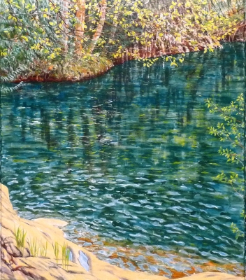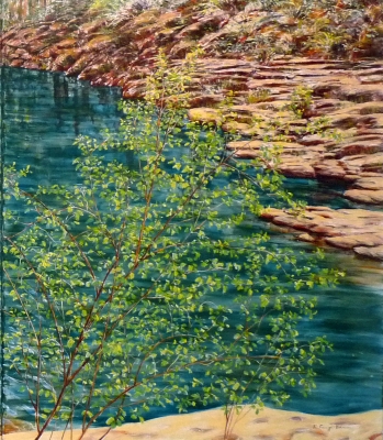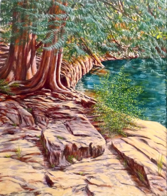 Lewis River Above Moulton Falls is a vitreous enamel painting created by artist Kathleen Frugé-Brown for Amboy Middle School. The imagery celebrates the natural beauty of Southwestern Washington. It encourages students to be aware of the landscape that surrounds them and shapes their lives. Moulton Falls is a regional park in the town of Yacolt that features two waterfalls and volcanic rock formations.
