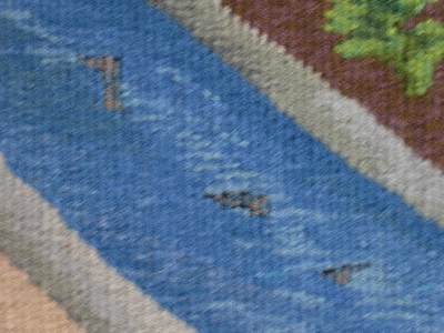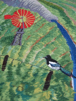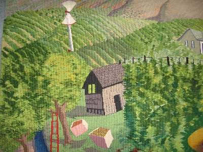 Artist Cecilia Blomberg created The Moxee Tapestry for Moxee Elementary School. She researched the area's history and community, gathering images and creating sketches. These became the design for her handwoven tapestry. She included images of Mount Elephant, an irrigation canal, apple trees, a landmark homestead, and an original Moxee schoolhouse. You can see two children, one contemporary and one historical, in the foreground. She notes, "My goal was to create a feeling of being in the center of the state, a sense of openness, warmth and playfulness. The water-filled irrigation canal flowing from the elephant's trunk forms a welcoming circle of life, and represents the center of the world for the children who live here. The people in Moxee have come from all over the world to find a home and to work to make the land produce food for all of us."