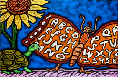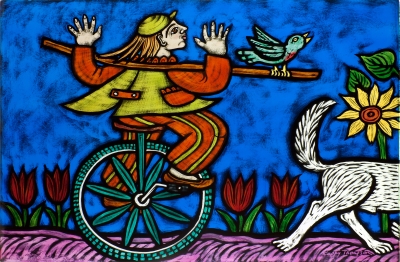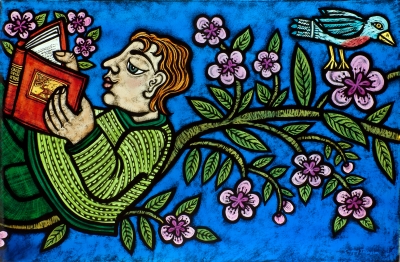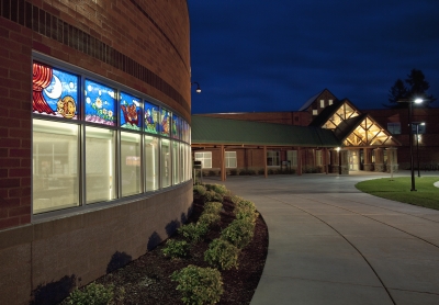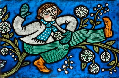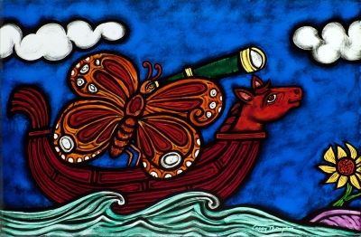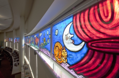 Artist Cappy Thompson created this glass artwork for Tukes Valley Primary School with elementary and middle school-aged students in mind. It is a horizontal frieze of thirty-two painted glass windows in the Learning Resource Center. Half of the windows show a parade of activities that the younger students might undertake in a day, such as reading, riding a bicycle, and playing musical instruments. The other half of the windows represent each of the four seasons with older children, plants, and animals. The title They Sailed Away for a Year and a Day and some of the images are inspired by the poem The Owl and the Pussycat by Edward Lear. The artist also included herself in the artwork as the woman sailing in a boat shaped like a goose.