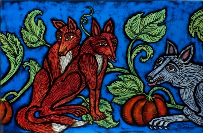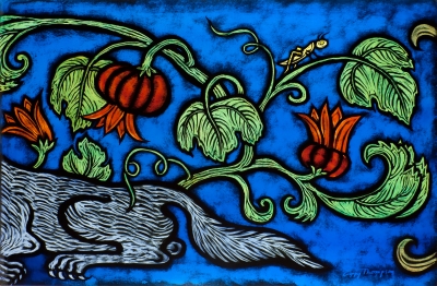 To create her vivid and detailed scenes, Thompson often uses a glass painting technique called "grisaille" where black line drawings are painted on glass, which is then fired in a kiln to make the line drawings permanent. Grisaille has existed since medieval times (approximately 450-1450) and is what you often see in stained glass windows in European churches.