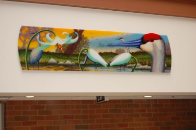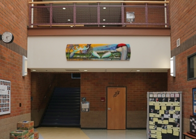 Attention, Distraction is one of four "glass painting" wall sculptures created by artist Michael Dupille for Daybreak Primary School in Battle Ground. The plants and animals of Southwestern Washington inspired this artwork. In this piece, he highlights the beauty and similarity of two native species: the Fawn Lily flower and the Sandhill Crane bird. Dupille creates his “glass paintings” using different colors of crushed glass called "frit" which he layers and fires in a hot kiln to create a vibrant, sculptural artwork.