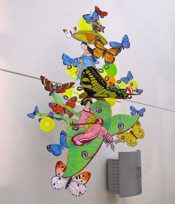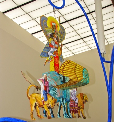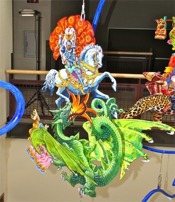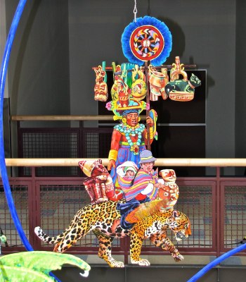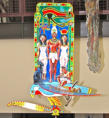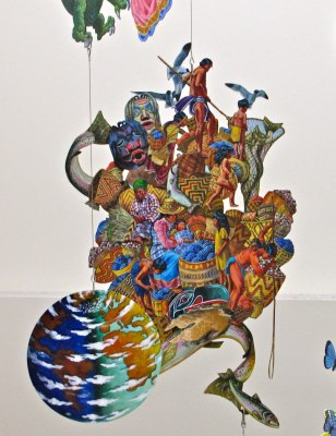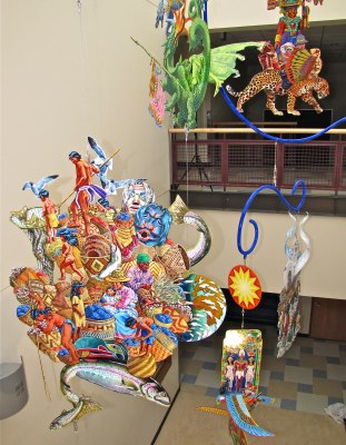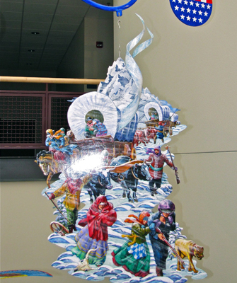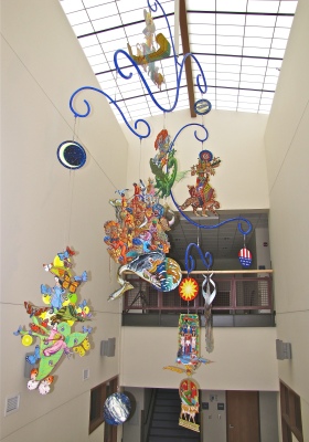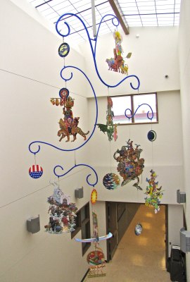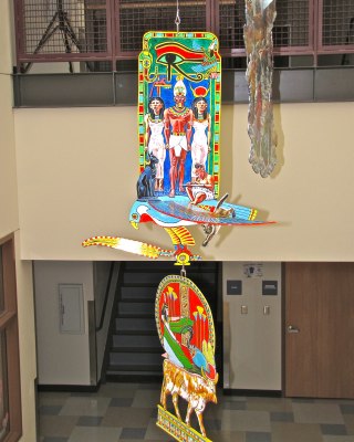 The seven main parts of the Wings Around the World by Terry Furchgott hanging mobile illustrate key units from the history curriculum of grades 5-8. They include the Native American Tribes who first lived in the Battle Ground area in Southwestern Washington, European pioneers, medieval Europe (approximately 450-1450), and the more ancient cultures of Asia (Japan), Meso-America (Mexico, Peru, Guatemala), Africa (Egypt), and the Middle East (Babylon, Assyria, Mesopotamia). There are six additional circular pieces that represent the sun, new moon, full moon, the American flag, the planet Earth, and the Milky Way galaxy. Furchgott notes that "the connection with their ongoing studies ensures that students will come to understand the imagery in greater depth as they move up in age and grade." The mobile is 20 feet high and 12 feet wide, and the parts are all perfectly balanced against each other. Steel swivels are attached to the main hanger of each of the seven parts. This allows them to spin in place for a full 360 degrees and also to move around each other.