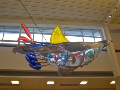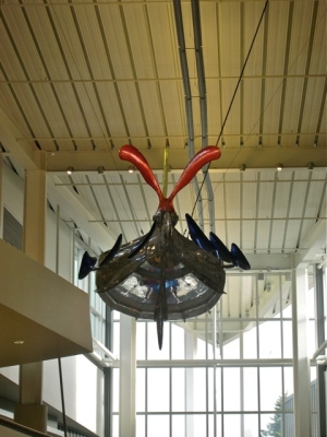 Wayne Chabre's sculptural chandelier "Silver Seed" evokes "a ship, an airplane, and a seed following currents from continent to continent," each transporting information and culture around the world and beyond.
