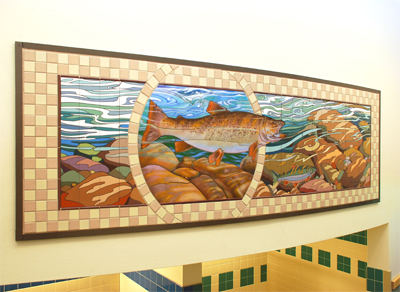 Ken Spiering's Fulfilling One's Destiny; Advancing Against the Current references fishing on Orting's Puyallup and Carbon Rivers. The city of Orting sits in a fertile valley between the two major rivers, 30 miles from Mount Rainier, in Western Washington. The tile artwork also suggests the acts of demonstrating leadership and creativity even if it means swimming upstream.