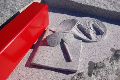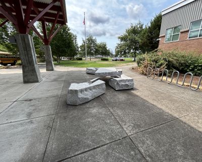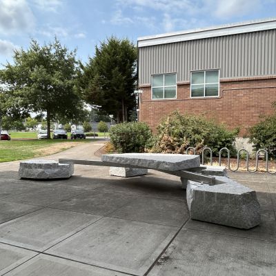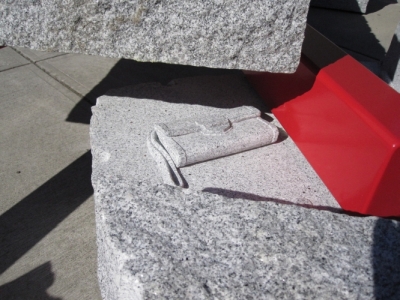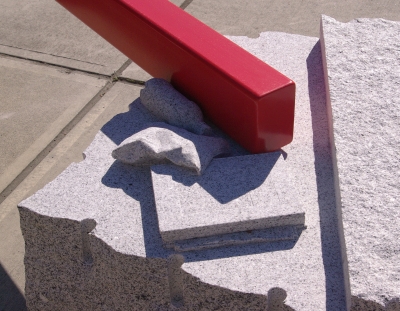 Water Skipper with Flotsam is a carved stone gathering place and informal seating area created by artist Brian Goldbloom. The overall form is like a low-slung animal, such as a spider or crab – or water skipper insect – with a crouching tension above the ground. But the artwork's shape also offers an invitation to the plaza, with its extended arms. Goldbloom notes, "As you approach, carved details become visible. These details are recognizable objects, as if left behind, or stepped away from, by users of the space – except that they are carved from granite of course – suggesting evidence of activity in the space and indicating the passage of time." Some of the carved details are books, food snacks, and sunglasses.