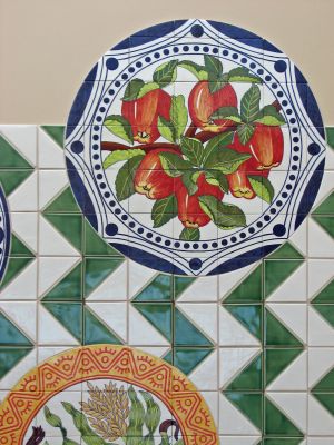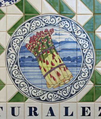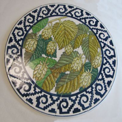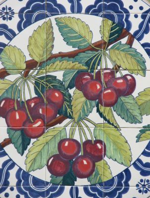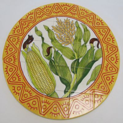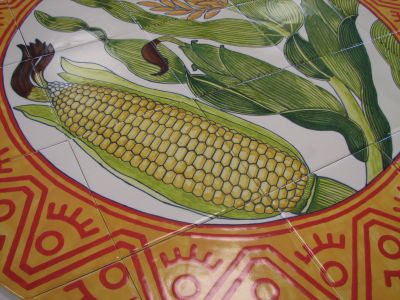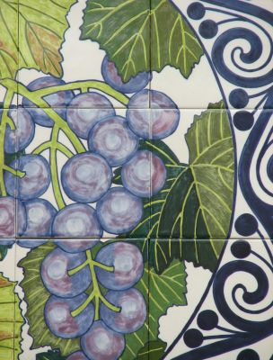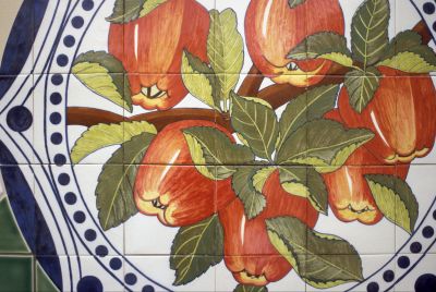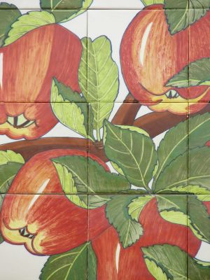 In this tile artwork, artist Maggie Smith depicts six important crops local to the farming communities around Sunnyside, Central Washington. The crops shown are apples, grapes, asparagus, cherries, corn, and hops.