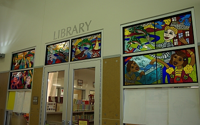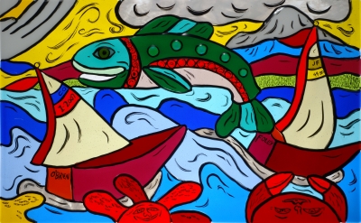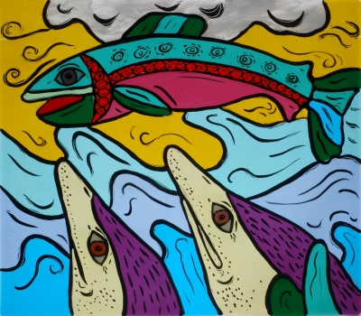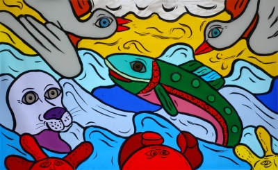 Artist Cheri O'Brien's Setting the Fish Free was inspired by a large fish tank located at North Hill Elementary School which she thought was a wonderful hands-on learning experience for the children. Her goal was to bring a larger picture of the nearby marina and sea creatures of Puget Sound into the school. She also wanted to show the life cycle of salmon, from fry to sea-going fish.