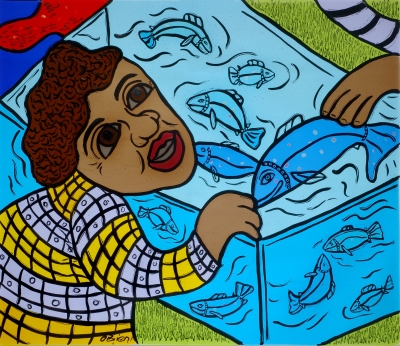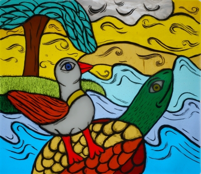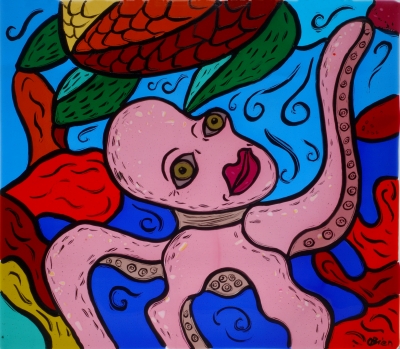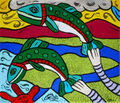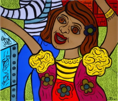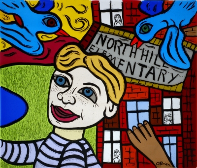 Northwest artist Cheri O'Brien creates quirky and humorous narrative folk-compositions. She uses many different materials, including oil painting, paper-mache sculpture, and painted glass. In her own words, "My paintings are reflections of my life as an artist, mother, and observer. I attempt to understand my world with finding humor in beauty and the beauty of humor."