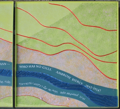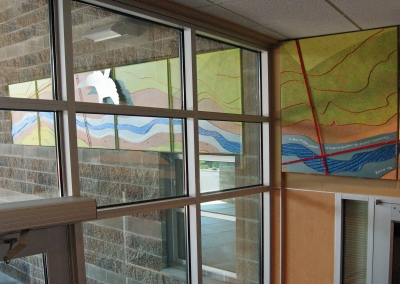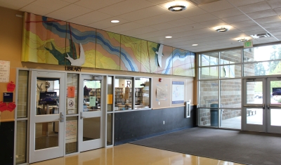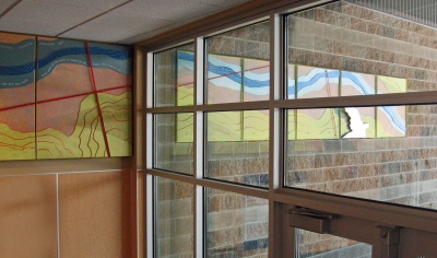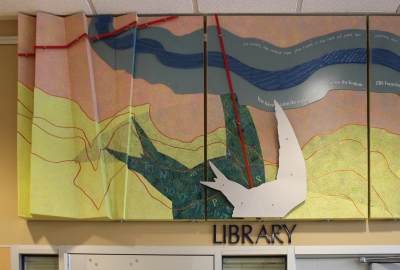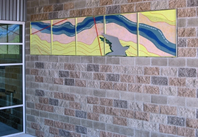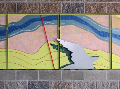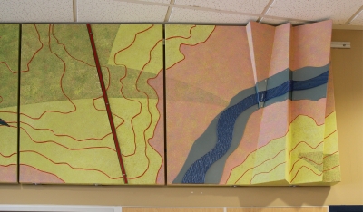Stuart Nakamura's mural at Bothell High School can be viewed as a three-dimensional contour map; the artwork celebrates the geography of Bothell and the surrounding terrain from a bird's perspective.