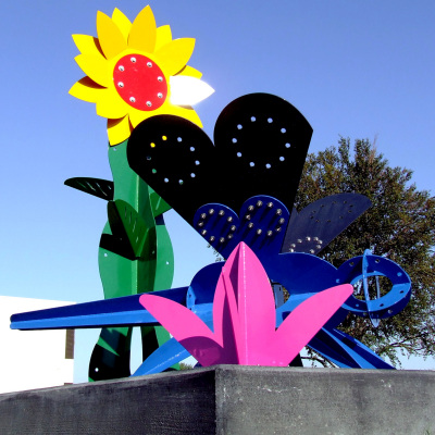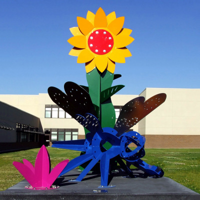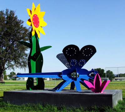 Artist Mauricio Robalino hopes to inspire creativity and curiosity with this large, colorful, metal sculpture at Jason Lee Elementary School in Richland, Southeastern Washington. Big World features a larger-than-life blue dragonfly, a purple lily flower, and a twelve-foot tall sunflower, plus two multi-colored mosaic-covered balls. It is a sweet sculpture that is optimistic and joyful.