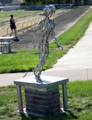 Symphony in Five Movements - Jogger is part of a suite of five interactive sculptures created by artist Ken Turner for the Washington State School for the Blind. He created the five figures to celebrate sports activities popular with blind athletes. They celebrate the grace and tenacity of the school's community. At the base of each sculpture, Turner installed metal poles that create a tone when struck with a cane. Each sculpture creates a different tone. Together the sculptures engage sight, sound, and touch.