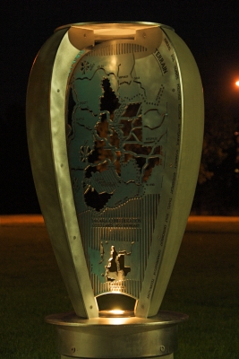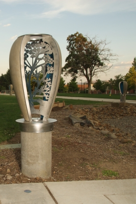 These eight vase-shaped sculptures hold silhouette cutouts of natural and cultural resources within. Silhouettes include: Lomatium root and plant, a Great Horned Owl, a map of 1855 Yakama Federation Territory boundary and a hand, dancers, faces, a sunburst, clouds, a storm and landscape components.