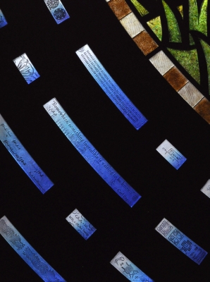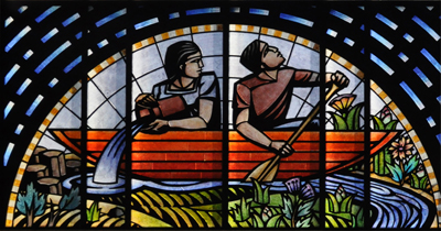 Artist Steve Gardner's Where Will You Go? focuses on the symbolic journey that students make during and after high school. Two figures in a boat travel down a river -- while one pours out water, creating their path and giving life to the dry land, the other gazes upwards at the stars to navigate. Overhead and around them, the sky is filled with a semi-circular galaxy of blue glass castings that are like stars in the turning night sky, as well as lines of text on a page. All of the glass elements contain cast relief imagery of learning: formulas, drawings, and text, chosen with the Pasco High School faculty. The imagery also refers to the Columbia River which is at the center of the city of Pasco's identity and existence. The river was and is a source of transportation, food, and life in Southern Washington. The river is a symbolic path that leads out of the circle of stars, implying that the journey is boundless.
