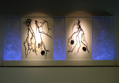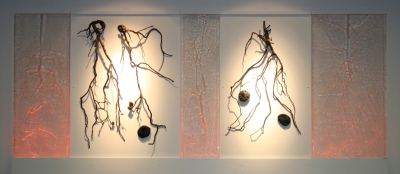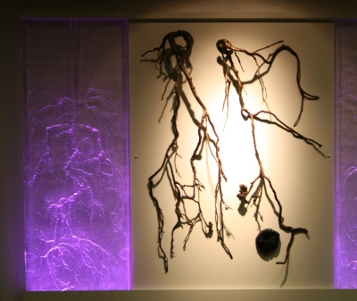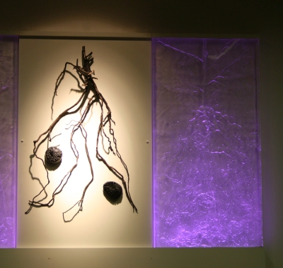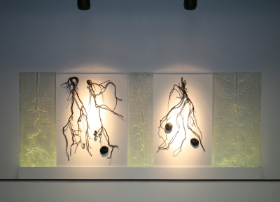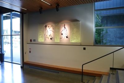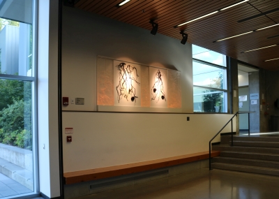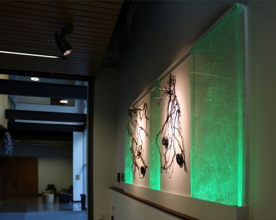 Artist Valerie Otani's Sequestered artwork was inspired by Cascadia College's attention to the environment in its campus architecture and landscape. The campus is bordered by towering evergreen trees and includes extensive restored wetlands. Its buildings are constructed with the highest standards of sustainability. To honor this commitment to the environment, Otani's artwork refers to the important role that trees play in storing carbon. It also encourages reflection on how we interact with the world around us. The cast glass is illuminated by LED lighting which draws a very small amount of power. The artwork's other materials are both archival and recyclable.