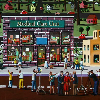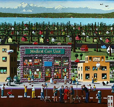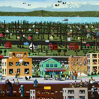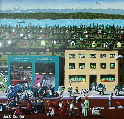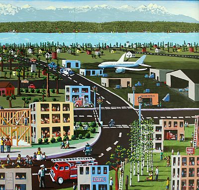 Artist Jack Gunter created the mural Futureville for the Sno-Isle Tech Skills Center in Everett, Washington. It is his first public art project with the Washington State Arts Commission. The mural features a birds-eye view of Everett, with many details showing how daily life may be seen in the future. The artist notes, "everyone on the streets of a future village are practicing the trades that make a community complete."