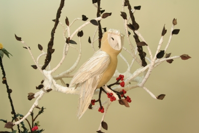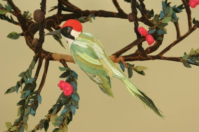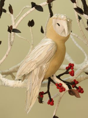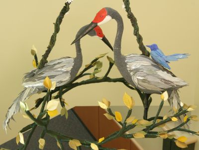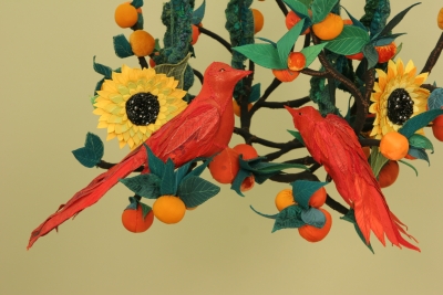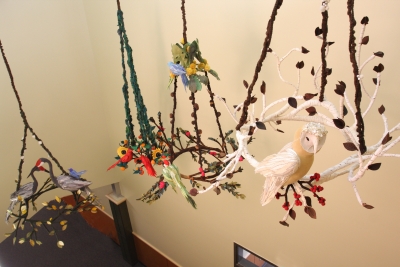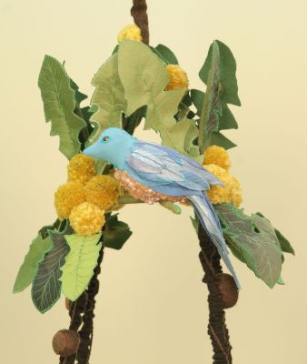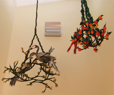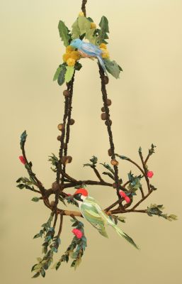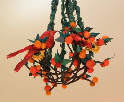 Artist Mandy Greer's four, mixed media chandeliers The Universe Awakens to the Child represent the wonder and bounty of the natural world. This theme has inspired human cultures around the world and throughout time. The artwork pairs the four seasons (spring, summer, fall, winter) with the four elements (air, fire, water, earth). Each chandelier portrays birds, trees, and plants selected from folk tales around the world. Greer was especially interested in birds because humans have always marveled at birds and their ability to visit both the earth and the sky. Greer chose bird varieties (swallows, tanagers, a woodpecker, bluebirds, cranes, and an owl) that are considered protectors and patrons of children. These birds also represent ideas that are important to children—such as play, independence, and the quest for knowledge. Greer notes that "world mythology is full of comforters and guardians of children who care for them along their journey through childhood. This collection of hand-stitched plants and birds bloom at the threshold of the school, where children both enter into a nurturing world of learning and exit into the larger world to make their own way."