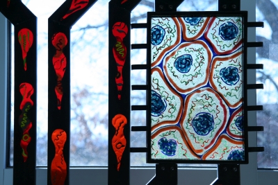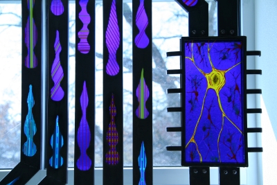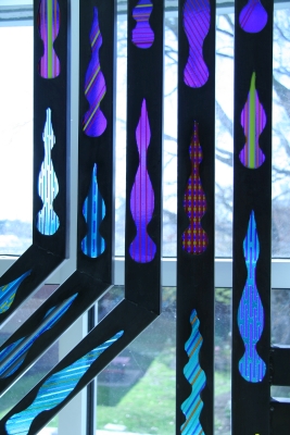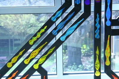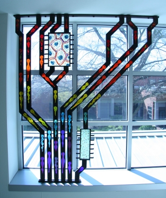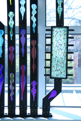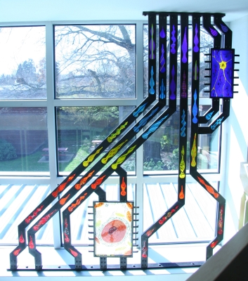 For the Urgent Messages artwork, artist Sumi Wu created a steel structure shaped like a circuit board. It is the framework for fused glass forms based on plant, animal, and nerve cells. She blends technology and biology to ask how these fields are similar, and how they intersect, now and in the future. Wu notes that "I see a parallel in electronics and biology. On the microscopic level, complex processes occur that we cannot see or directly experience, yet they determine the shape of our daily lives." Urgent Messages and its partner artwork "Sky Machine" were created for buildings at Clark College where Wu herself learned to weld. The artworks reflect the technical nature of the subjects studied in the Applied Arts building complex.