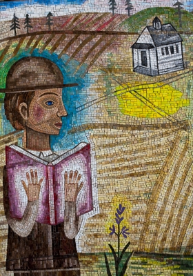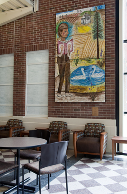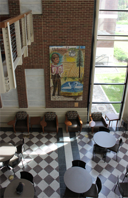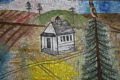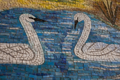 Joanne Hammer's glass and marble mosaic tile artwork honors the history of the building where it's sited, Hargreaves Hall. Hammer pays tribute to the local area with imagery of the Palouse landscape and a reference to Turnbull National Wildlife Refuge, both in Eastern Washington.