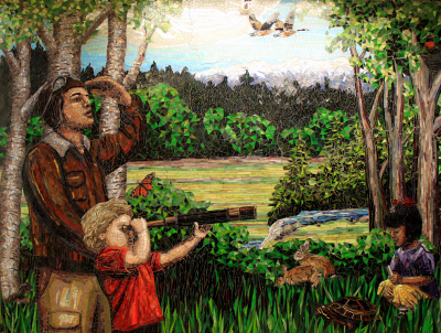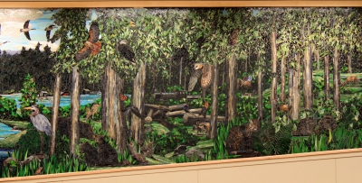 Heritage are a suite of two mosaic murals created by artist team Carl Bryant and Sandra Bryant. They created the murals for Nelson Elementary School in Graham, in Northwest Washington. In this larger mural, a navigator and two children explore Graham's history and natural beauty. The artists filled the mosaic with the area's animals, birds, and natural landmarks. A flock of migrating Canada geese flies through both murals. They suggest how learning and education can be a cooperative adventure. The artists note, "We celebrate relationships between humanity and our environment, our human connections, how our experiences intertwine, our history, our feelings over time and of the moment."