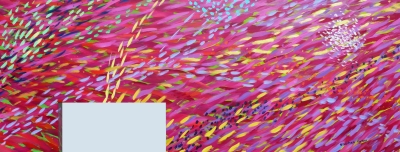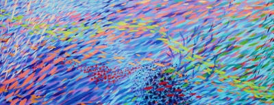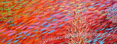 Stephen Yates' band of eleven vibrantly painted panels All the Colors is located on three walls of Cedarhurst Elementary's entryway. The artwork suggests "moving currents, schools of fish, seaweed, shimmering light filtering from the surface down, and mysterious shadows drifting through space."
