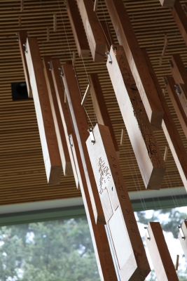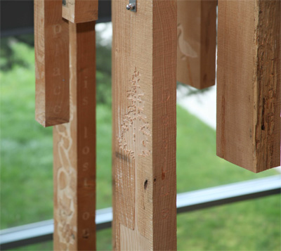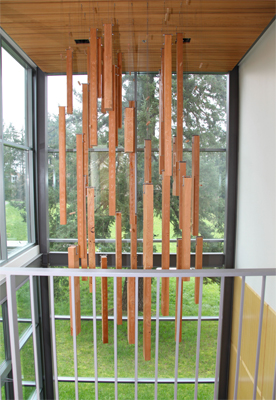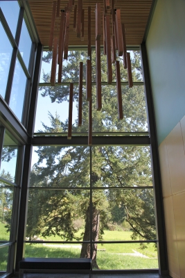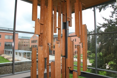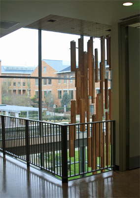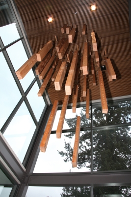 Artist Stuart Schechter created Impressions from a Douglas fir tree that was cut down to make way for the new building. Schechter mapped the tree, cut it into planks, and hung each of the thirty-nine planks in the same position it occupied before being cut, creating an abstracted cross-section of the tree. He added carved symbols of the Vancouver area past and present, such as a bear, trees, and salmon, and words and phrases. As he worked on the sculpture, Schechter kept wondering "What kind of impression will I leave on earth?" From the second-floor balcony, you can see that the words on the planks start to unite into stanzas and a poem about being "lost" – in nature, in a forest, in yourself. Schechter notes that "In a way the tree has come home. This tree lay in a field for two years before I found that it still existed… The tree traveled back to its original spot where I hope it stays for a long while." The words on the planks are from the poem Lost by David Wagoner, whose main subject is the natural environment of the Pacific Northwest.