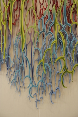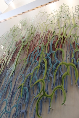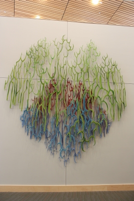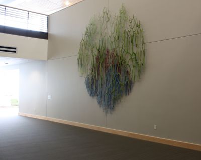 In Life Sign artist Katy Stone represents themes of life and interconnectedness. Stone layers cut metal to create repeating patterns and shapes found in nature, from forests, plants and roots to the body's vascular system of blood vessels. The green, red, and blue colors are found both in nature outdoors and in the interior of the body. Overall Life Sign looks like a raindrop or a leaf, or a heart. Stone notes that the artwork "expresses the idea of life at both the microscopic and macroscopic level, and symbolizes the concept of interconnectedness". The artwork's themes also connect the setting of the building, which has spectacular views of the surrounding trees and mountains, to the Health Sciences subjects taught within it.