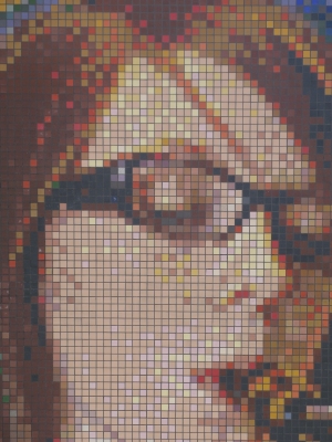 Artist Mike Mandel uses bridges as the main symbol of Seeing Blue, his mosaic mural artwork. Bridges literally and figuratively link the Tri-Cities communities of Southeastern Washington and the students who are the future of the community. A student is seen engaging in the community by making music. Mandel extended the bridge symbolism with the imagery of school stairway railings in the background. The artwork's title Seeing Blue and its main color also reference Chiawana High School's school motto, "See Blue In All You Do." Seeing Blue dominates the main two-story hallway of Chiawana High School and is based on photos of students. It consists of four 13 by 18 foot mosaic panels, composed of more than 137,000 one-inch porcelain and glass tiles, with over seventy-five different colors. The artist has based the mural’s look and process on the marriage of the camera and the computer: each tile represents one pixel on the computer screen.