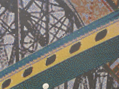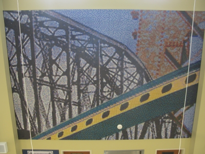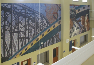 Artist Mike Mandel uses bridges as the main symbol of Seeing Blue, his mosaic mural artwork. Bridges literally and figuratively link the Tri-Cities communities of Southeastern Washington and the students who are the future of the community. Mandel also included imagery of the region’s iconic Blue Bridge and the old Northern Pacific Bridge that connect the three communities of Pasco, Kennewick, and Richland. The artwork's title Seeing Blue and its main color also reference Chiawana High School's school motto, "See Blue In All You Do." Seeing Blue dominates the main two-story hallway of Chiawana High School and is based on photos of students. It consists of four 13 by 18 foot mosaic panels, composed of more than 137,000 one-inch porcelain and glass tiles, with over seventy-five different colors. The artist has based the mural’s look and process on the marriage of the camera and the computer: each tile represents one pixel on the computer screen.
