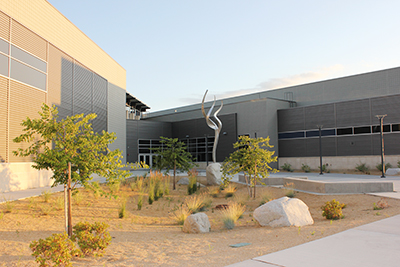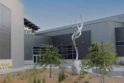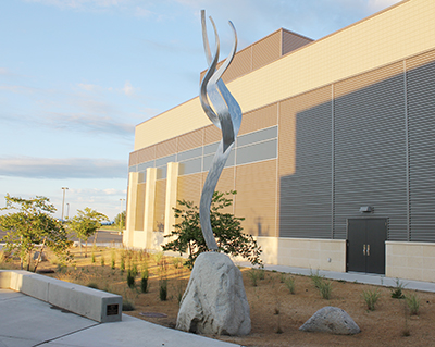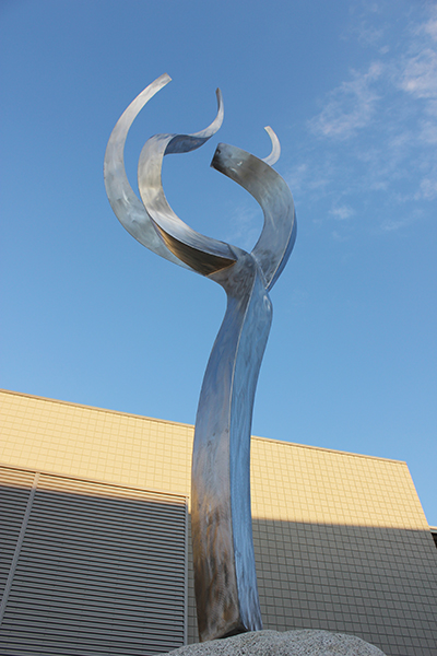 Aspire by Micajah Bienvenu is a kinetic sculpture that symbolizes the trifecta of Community, Faculty (and other school staff), and Students which make up a successful learning experience. It is made of three spirals whose shapes are based on formulas found in nature, such as the patterns of tree branches or antler prongs. The largest spiral rotates on a central point with wind or human power. And it is a support for the second-largest spiral, which is a support for the smallest spiral. The spirals all share the same base, but branch off from each other independently.