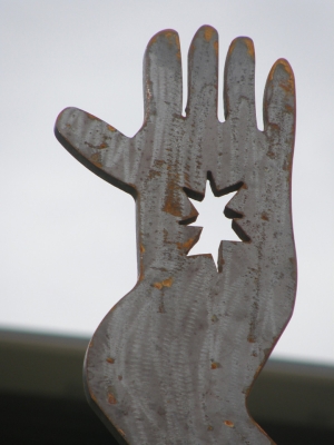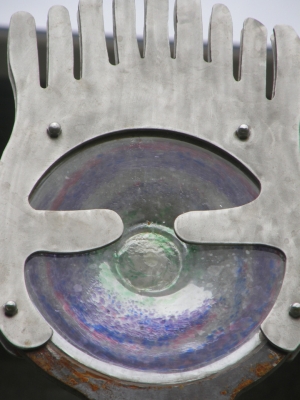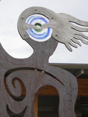 Artist David Govedare brings together "primal energy and modern technology" in these three steel sculptures of the human form. Each figure contains a disc of glass and stylized cut-outs.