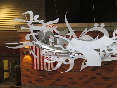 Wayne Chabre's sculpture, in the form of a Mӧbius strip embellished with signs and symbols of language and human culture, represents the concept of infinity and the flow of knowledge.