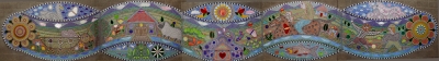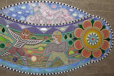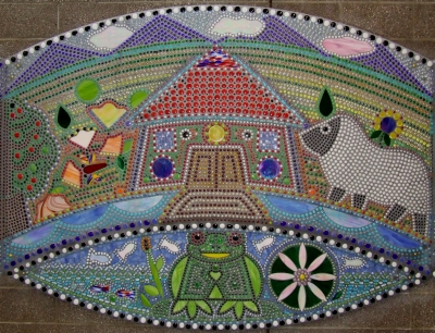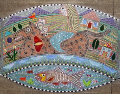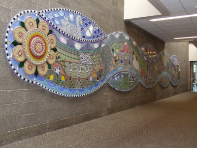 Artist Mauricio Robalino's colorful and playful glass mosaic A Day in Walla Walla celebrates the city of Walla Walla in Southeastern Washington. The mosaic was inspired by drawings that the school's students made with Robalino, as well as by his own exploration of the local area and city. Featured imagery includes animals, houses, horseback riding, salmon, a baseball game, the sun, and more.