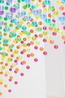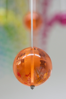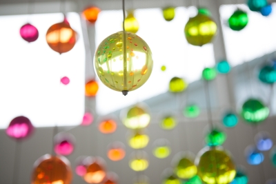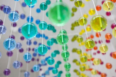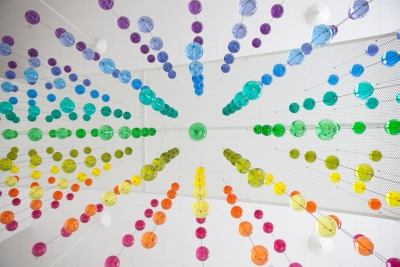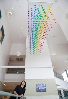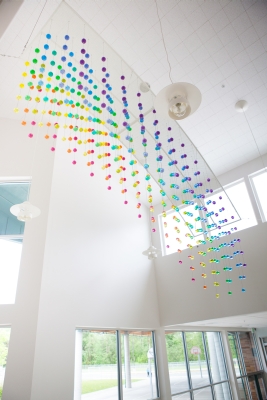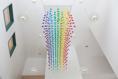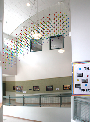 Etsuko Ichikawa's Spectrum of Light consists of hundreds of colorful cast-resin spheres evoking a rainbow. The artwork is sited to take advantage of the abundant natural light of the Frederickson Elementary first floor entranceway, which activates the translucent balls.