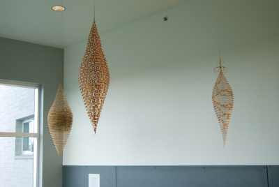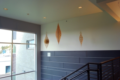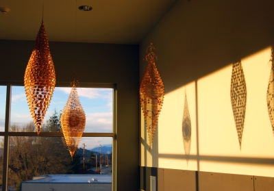 Artist Lanny Bergner's sculpture ‘Core’ celebrates natural and organic shapes. Using only pliers and scissors, Bergner hand-worked industrially woven bronze and aluminum mesh strips to create the semi-transparent, cocoon-like construction. The sculpture also contains small berry-like forms of crushed glass “frit” and vines made of heavier copper wire. This is one of five artworks by Lanny Bergner at the Northwest Career and Technical Academy in Mount Vernon, Northwest Washington. The artworks reference plant biology, micro-organisms, cosmology (the science of the origin and development of the universe), undersea life forms, and the human body. They examine where nature and industry merge, and celebrate “the mystery and wonder of it all.”