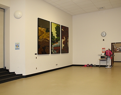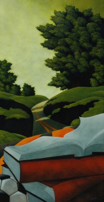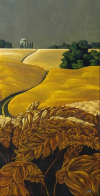 Using landscape as metaphor, Erik Hall's three-panel painting What Grows Here represents the educational journey of students during their time at Connell Elementary in Central Washington. Each panel narrates a different period in the students' development. The first panel shows a wheat field, which is a common sight around Connell. The field is made of countless individual stalks that all grow from the same earth, like a community that is made of many different individuals. The second panel shows a road with books and a soccer ball. It illustrates the importance of both physical and mental education. The final panel shows a twisted tree that climbs to an out-of-sight destination, representing an unknown future. Hall included this text on the artwork's plaque: "I imagined you as a strand of wheat. You were born here; a component of this landscape. You will get tall and leave this place. Your work is to nourish the world, but how will be up to you."