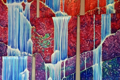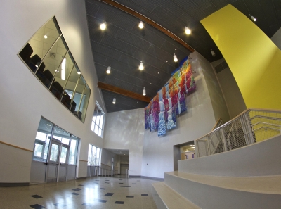 Illuminated Passage by Steven Scheibe uses silk banners to create a cascading waterfall that complements the architectural idea of the entrance area as a slot canyon. Projected lighting casts a rippling light around the space during the beginning and end of each day. Scheibe notes that "Students passing through Liberty Middle School—and adolescence—are like gathered river waters navigating into, through, and out of a canyon to a completely new environment...Twice daily, like sunrise and sunset, rippling water-effect light floods the room to celebrate the students’ arrival and departure—heralding their progress and passage."