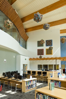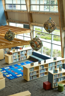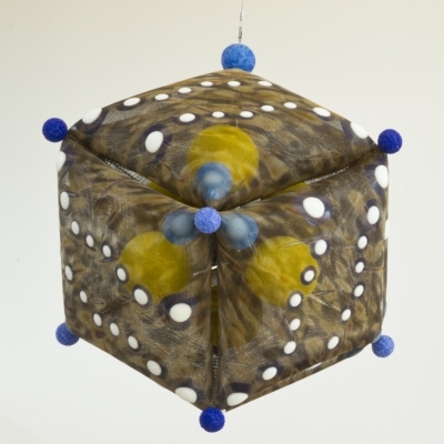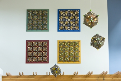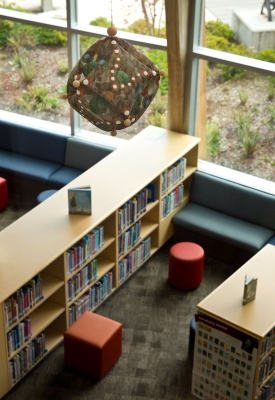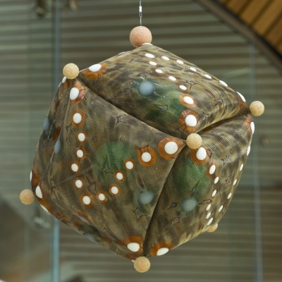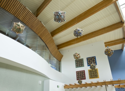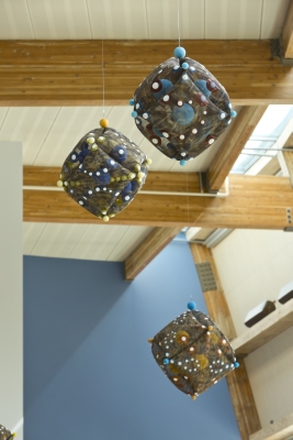 ‘Pattern Play’ by artist Lanny Bergner is comprised of four wall-mounted, relief sculptures and seven suspended sculptures. All of the artworks are pillow-like. Their imagery suggests atmospheric patterns, cloud-like formations, circular droplets, and electrical sparks. Bergner was inspired by the youthful and endless energy found at Machias Elementary in Snohomish, Western Washington. The artwork’s title refers to the relationship of pattern to form and the simple, playful rotation of forms.