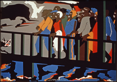 Artist Janet Marcavage created this screen print. It is part of her exploration of the patterns, movement, and meaning of textiles in daily life. She notes, "Observing and drawing from striped and gingham fabrics, I enjoy the way that these patterns shift meaning based on the form in which they take, such as the form of a table, girl, man or laundry pile."