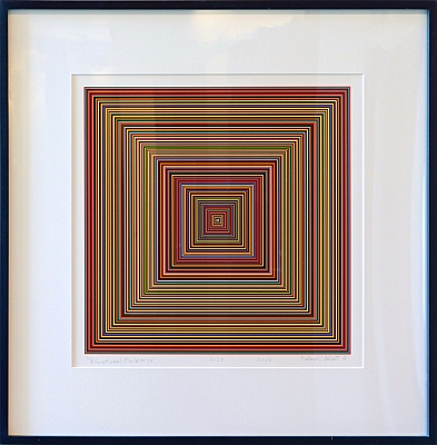 Created during the last year of artist Dick Elliott's life, Vibrational Field #38 is a digital print. It follows Elliott’s decades-long focus on color, geometry, and light, while also exploring the artistic potential of using a computer and creating digital media. Elliott is known for using industrial highway reflectors (that are only available in five colors) as his main material, but in 2007 he changed his art methods and materials to accommodate limitations imposed by his diagnosis of pancreatic cancer. The computer allowed him to use 4,000 different colors and produce artworks much more quickly and easily, without the physical efforts. He considered this new approach and the resulting series of ‘Vibrational Field Paintings' as the "summation of forty years of thinking about the possibilities of what art can be."