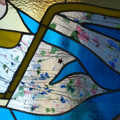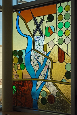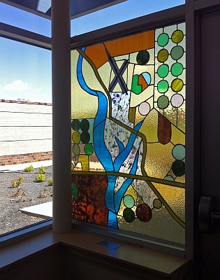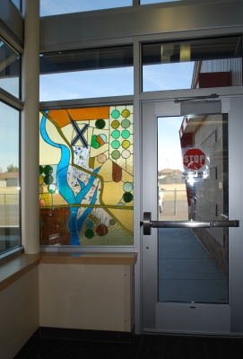 Artist Katherine Holzknecht created Reference Point: From Space as part of a series of four stained glass windows for Park Orchard Elementary School. Each window represents a different "reference point" view of the local Moses Lake area in Central Washington. The windows are found at each of the four corners of the school. Holzknecht notes, “I started thinking about reference points, and how we place ourselves in the world by points of reference, that is, our physical mailing address, the town, county, and state we live in, time zones and that sort of thing.” The natural beauty of the desert-like landscape of Central Washington is also celebrated by the windows. For this window, Holzknecht used satellite imagery to create a view from above of the school and its surrounding communities. The window also shows the local waterways, crop circles, and more. Park Orchard Elementary School is represented by a small red star. The other three windows show local plants, animals, fish, and landscapes.