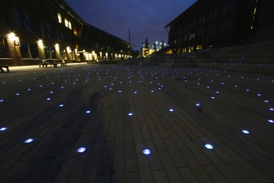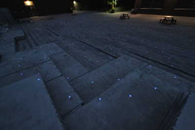 Artist Dan Corson's Fibonacci Echoes is an outdoor installation of overlapping concentric rings that call to mind echoes and raindrops. Comprised of 424 blue solar LED lights, the installation is organized according to the Fibonacci sequence. In mathematics, the Fibonacci sequence is a pattern of numbers where each number is the sum of the two numbers before it. The Fibonacci sequence can be seen in many forms and patterns in nature, such as a nautilus seashell, a sprouting fern frond, flower petal patterns, storm clouds, and more. The Fibonacci sequence was also influential to the architecture of the nearby Discovery Hall, located on the Bothell Campus of the University of Washington.