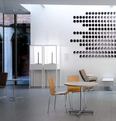 Artists Rebecca Cummins and Paul DeMarinis' three-part installation ‘Lunar Drift' offers viewers an insight into our spatial and temporal place in the universe. The kinetic sculpture ‘Lunar Drift' features two mechanisms that move slowly over time to track the position of the moon and the sun. Thhese mechanisms form the basis of all clocks and calendars. Located at Western Washington University in the city of Bellingham in Northwestern Washington, the sculpture is supported by two installations on nearby walls. These graphics show the phases of the moon and changes in the Bellingham sky throughout 2014.