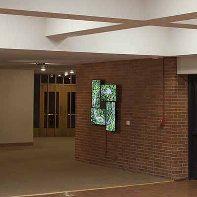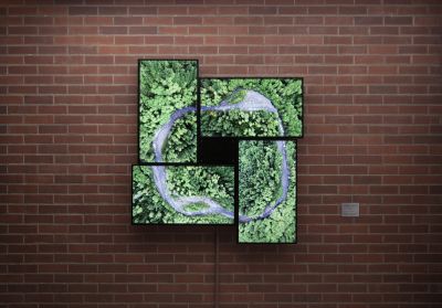 Artist Claude Zervas created the four-part video installation Nooksack Middle Fork as an exploration of circularity. It was also inspired by the ancient Greek philosopher Heraclitus, who stated "everything flows". The Nooksack River is located in the North Cascades mountains in Washington. Zervas notes that the Nooksack River "cuts through dense forest scarred by intensive logging, its water is diverted for cities to drink, and the glacier of its birth is slowly disappearing." This artwork comments on the relationship between man and nature.
