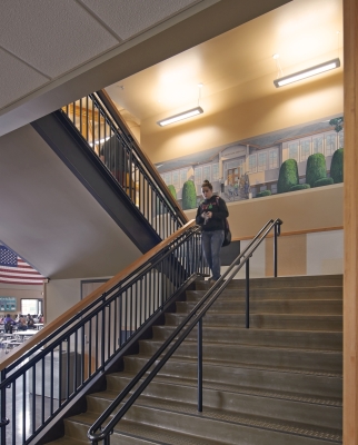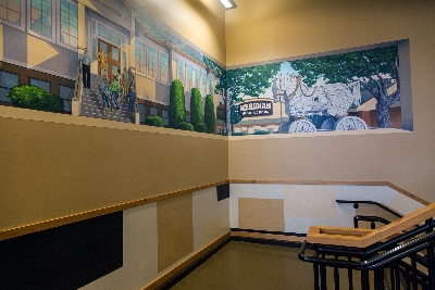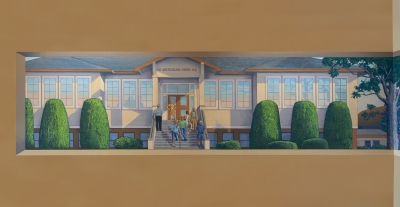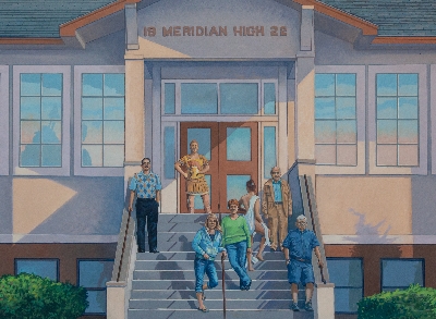 The Judgment of Paris are a suite of four murals by artist John Wehrle. He created them using "trompe l'oeil" visual illusions. This French term translates to "trick of the eye." Wehrle based several images on characters and events in "The Iliad", the ancient Greek (mid-8th century BCE), epic poem about the Trojan War. The Trojans are Meridian High School's mascot. These combined images celebrate Meridian's past, present and future. In this mural, figures from different eras and a Trojan horse gather in front of the school's original administration building.