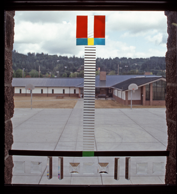 This piece is part of artist Garth Edward's group of sculptures installed throughout Green Hill School. The school provides education and vocational training for young male offenders as part of Washington's Juvenile Rehabilitation program. Using many different materials, Edwards fills the campus with imaginative and affirming imagery. A mural installed in the visitor's center shows the journey to learn a skilled trade and graduate. Painted aluminum sculptures of plant forms suggest growth and renewal. Concrete 'heads' look out over the grounds like protectors. Four aluminum benches at building entrances feature whimsical bear figures. Aluminum cutouts celebrate the many learning opportunities open to residents. Windows patterned with prisms cast rainbows into the interior spaces of the buildings. Together, these sculptures integrate into the facility and set a positive tone for resident rehabilitation.