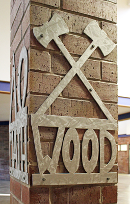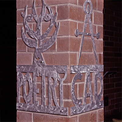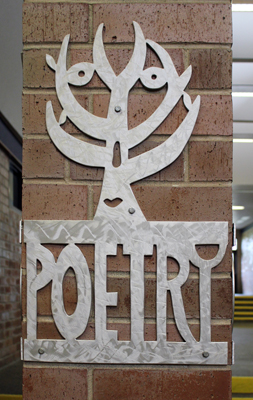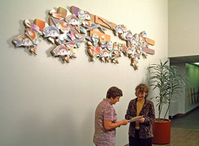 This piece is part of artist Garth Edward's group of sculptures installed throughout Green Hill School. The school provides education and vocational training for young male offenders as part of Washington's Juvenile Rehabilitation program. Using many different materials, Edwards fills the campus with imaginative and affirming imagery. A mural installed in the visitor's center shows the journey to learn a skilled trade and graduate. Painted aluminum sculptures of plant forms suggest growth and renewal. Concrete 'heads' look out over the grounds like protectors. Four aluminum benches at building entrances feature whimsical bear figures. Aluminum cutouts celebrate the many learning opportunities open to residents. Windows patterned with prisms cast rainbows into the interior spaces of the buildings. Together, these sculptures integrate into the facility and set a positive tone for resident rehabilitation.
