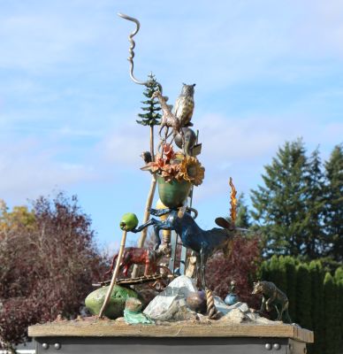 Artist Brad Rude's sculpture New Heights features a pyramid of animals, trees and plants, and man-made elements (ladder, boat, wheel, and bridges) interacting with the natural landscape at its base (snow-capped mountain, rivers, deserts, ocean shores, and islands). The artwork is displayed on a platform that is like a forest service lookout tower. Rude calls it a “diorama platform”. He notes: "as a tribute to the spirit of exploring what lies ahead of us, this sculpture illustrates possibilities and challenges posed when asking ourselves what we would like to become. By working together, we each discover our own unique path, while also lifting each other to New Heights."