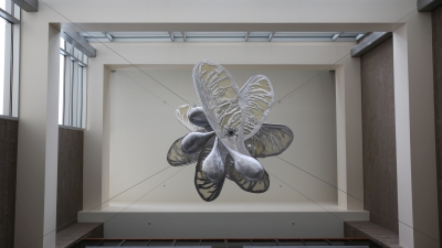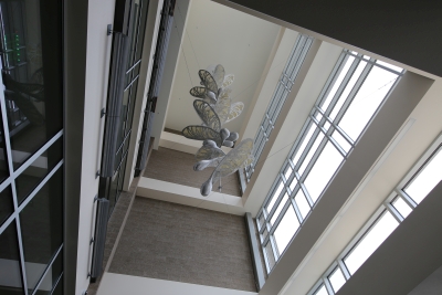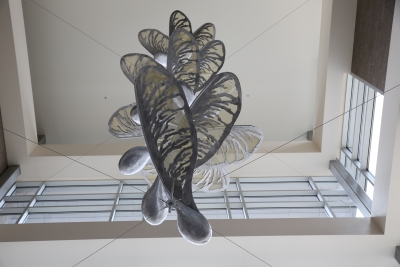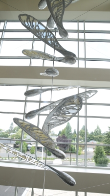 Samara is a suspended kinetic sculpture comprised of 16 aluminum maple seeds that rotate continually in a spiral formation. This pieces was created by artist team Kate Kaman and Joel Erland. Describing the inspiration for this piece, the collaborative artists note: "winged seed pods—known as whirligigs, helicopters, and other informal names—are called Samara by scientists. The maple seed represents the start of a new life. Much like flying whirligigs have the potential to grow into giant trees, each student at HeLa High School is full of great potential."