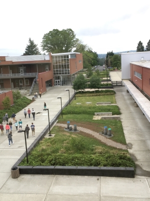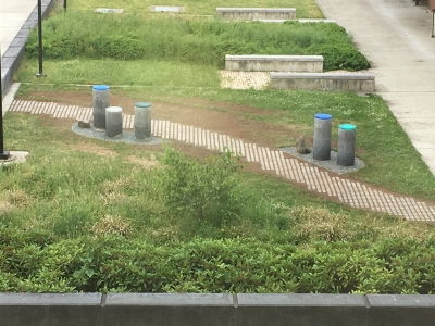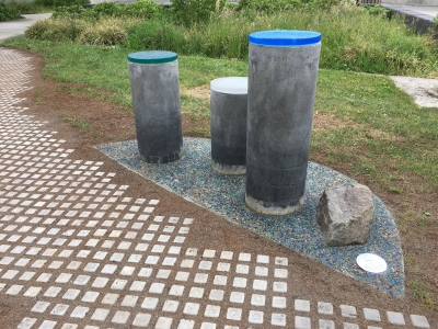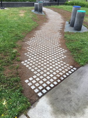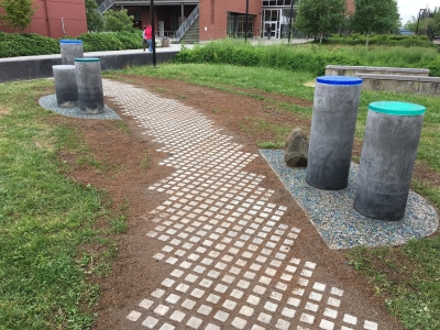 Artist Kristin Tollefson created the concrete tiled walkway titled 'Ebb and Flow' in reference to the constant flow and sinuous curves of the Snohomish River. She notes that the freestanding sculptural cylinders "suggest pier pilings marked by fluctuating water levels and double as seating perches for passersby."